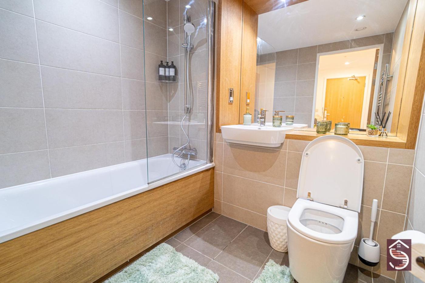 Two-Bedroom Apartment with Balcony. This spacious apartment features 1 living room, 2 separate bedrooms and 2 bathrooms with a bath and free toiletries. In the kitchen, guests will find a stovetop, a refrigerator, a dishwasher and an oven. The apartment features a washing machine, soundproof walls, a tea and coffee maker, a flat-screen TV with streaming services, as well as city views. The unit has 2 beds.